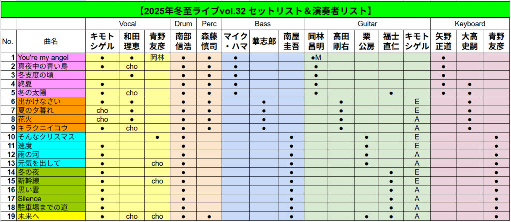 Storyのメンバー用のセトリはスプレッドシートで管理しています。今回はその一部を切り取って編集しました。これで各チームの構成がより具体的にわかると思います。